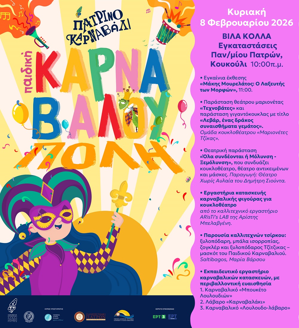 Με την 4η Καρναβαλούπολη συνεχίζει το παραμυθένιο ταξίδι του το Καρναβάλι των Μικρών κάνοντας έναν ακόμα σταθμό την Κυριακή 8 Φεβρουαρίου στις 10πμ στη Βίλα Κόλλα (εγκαταστάσεις Πανεπιστημίου Πατρών στο Κουκούλι). Πρόκειται για τη δεύτερη χρονιά που ΚΕΔΗΠ-Καρναβάλι Πάτρας και Πανεπιστήμιο Πατρών ενώνουν τις δυνάμεις τους και συνεργάζονται στο πλαίσιο της διοργάνωσης Καρναβαλούπολης.