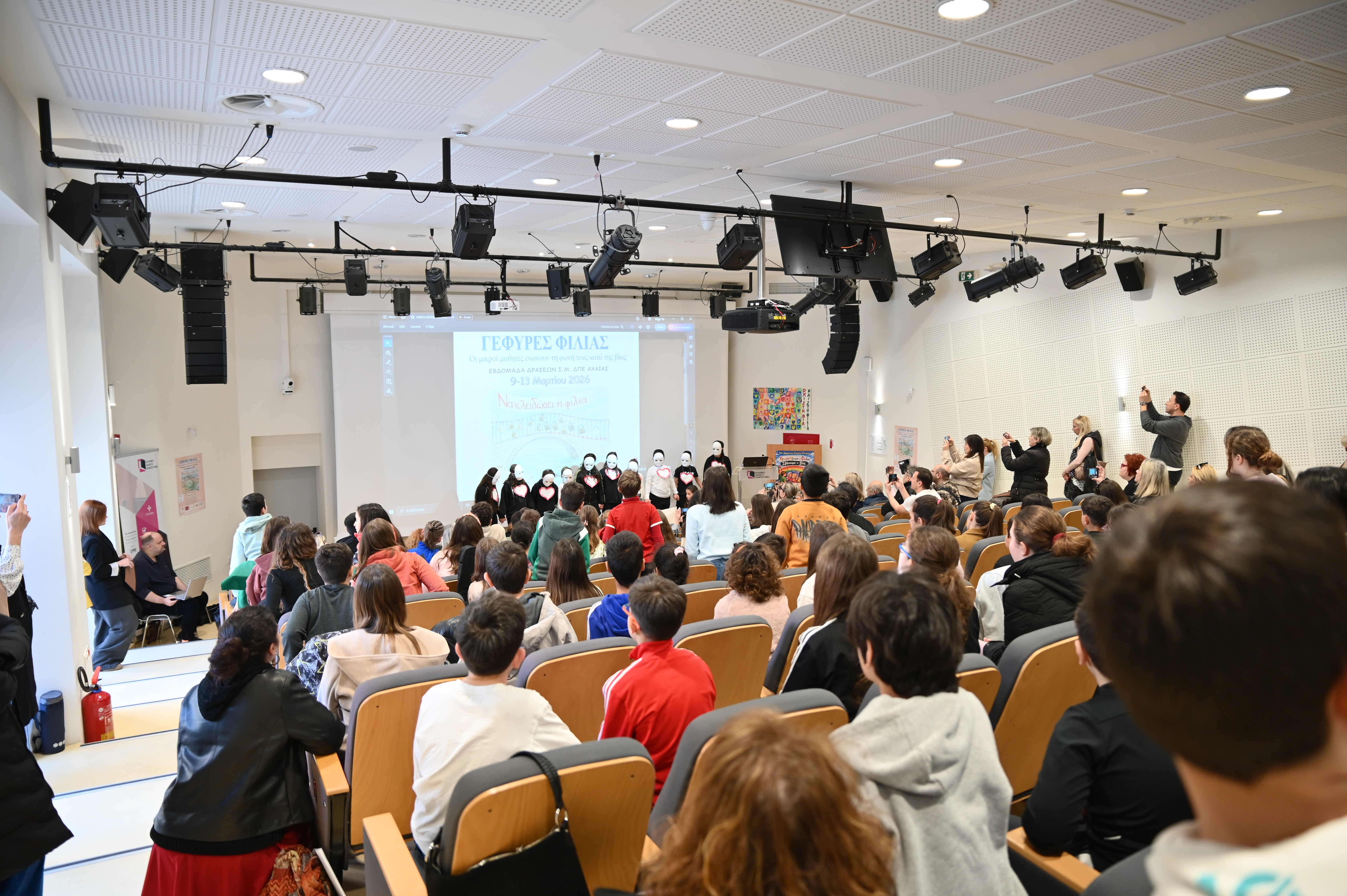Οι Σύμβουλοι Εκπαίδευσης της Διεύθυνσης Πρωτοβάθμιας Εκπαίδευσης Αχαΐας, σε συνεργασία με το Κέντρο Πρόληψης «Καλλίπολις» και τη συμμετοχή των Δήμων Πατρέων, Αιγιαλείας, Δυτικής Αχαΐας, Καλαβρύτων και Ερυμάνθου, πραγματοποίησαν Εβδομάδα Δράσεων κατά της Σχολικής Βίας και του Εκφοβισμού, με θέμα: «Γέφυρες φιλίας: Οι μικροί μαθητές και μαθήτριες της Αχαΐας ενώνουν τις φωνές τους κατά της βίας». Η εκδήλωση των σχολείων του Δήμου Πατρέων πραγματοποιήθηκε την Τετάρτη 11 Μαρτίου 2026, στο Αμφιθέατρο του Ελληνικού Ανοιχτού Πανεπιστημίου (Ε.Α.Π).