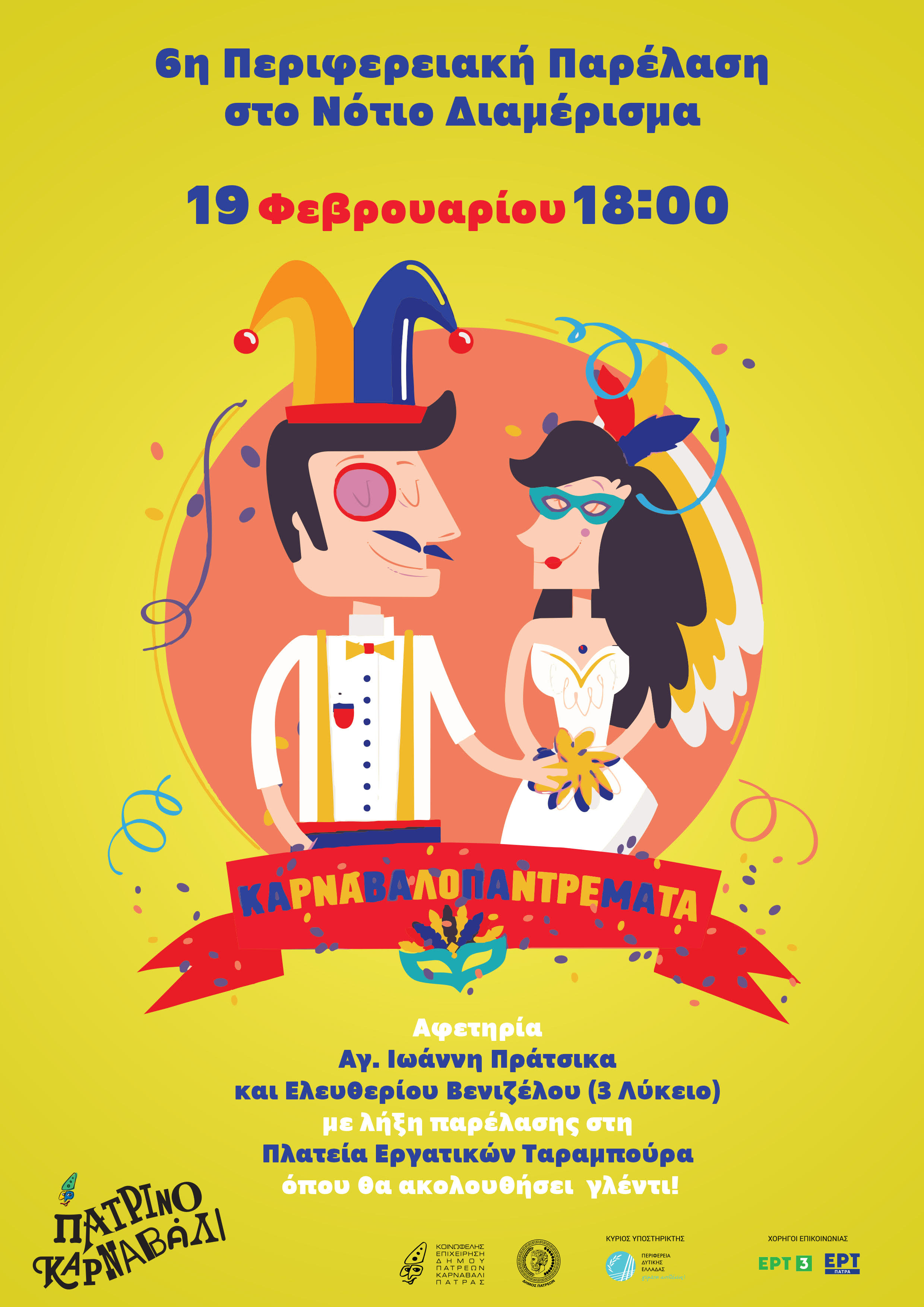 «Καρναβαλοπαντρέματα» θα είναι ο τίτλος της 6ης περιφερειακής καρναβαλικής παρέλασης, η οποία θα πραγματοποιηθεί στο Νότιο Διαμέρισμα και θα αρχίσει στις 6μμ έξω από το Γ΄ Γενικό Λύκειο Πατρών (συμβολή των οδών Αγ. Ι. Πράτσικα και Ελ. Βενιζέλου) και περνώντας από τους δρόμους της περιοχής θα καταλήξει στην πλατεία Εργατικών Ταραμπούρα.