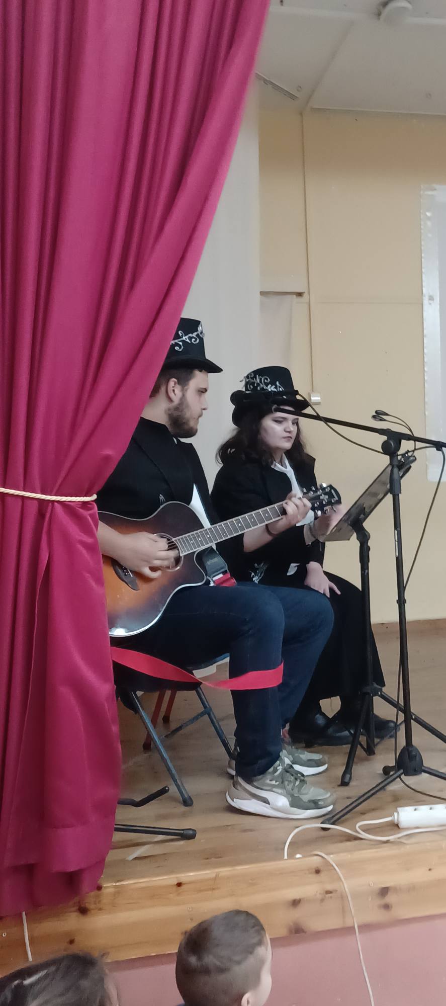 Στο ρόλο των αφηγητών και στο τραγούδι: ο Σωτήρης Πενιάς με την κιθάρα του και η Βασιλική Σιατερλή.