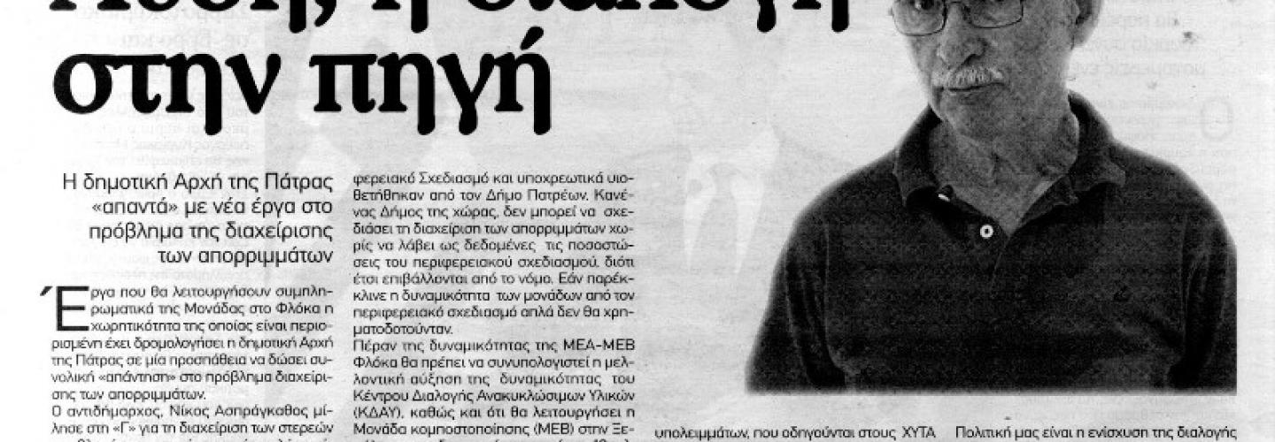 Επικαιρότητα Νίκος Ασπράγκαθος, στην εφημερίδα "Γνώμη" για την ανακύκλωση: "Λύση, η διαλογή στην πηγή" 26/10/2020