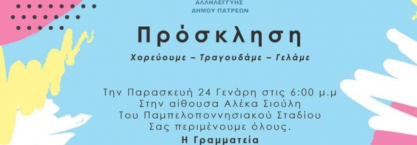 Εκδήλωση Ο Δήμος Πατρέων και το Λαϊκό Φροντιστήριο Αλληλεγγύης του Δήμου, διοργανώνουν πάρτι, για μαθητές, εκπαιδευτικούς και γονείς, την Παρασκευή 24 Ιανουαρίου 13/01/2020