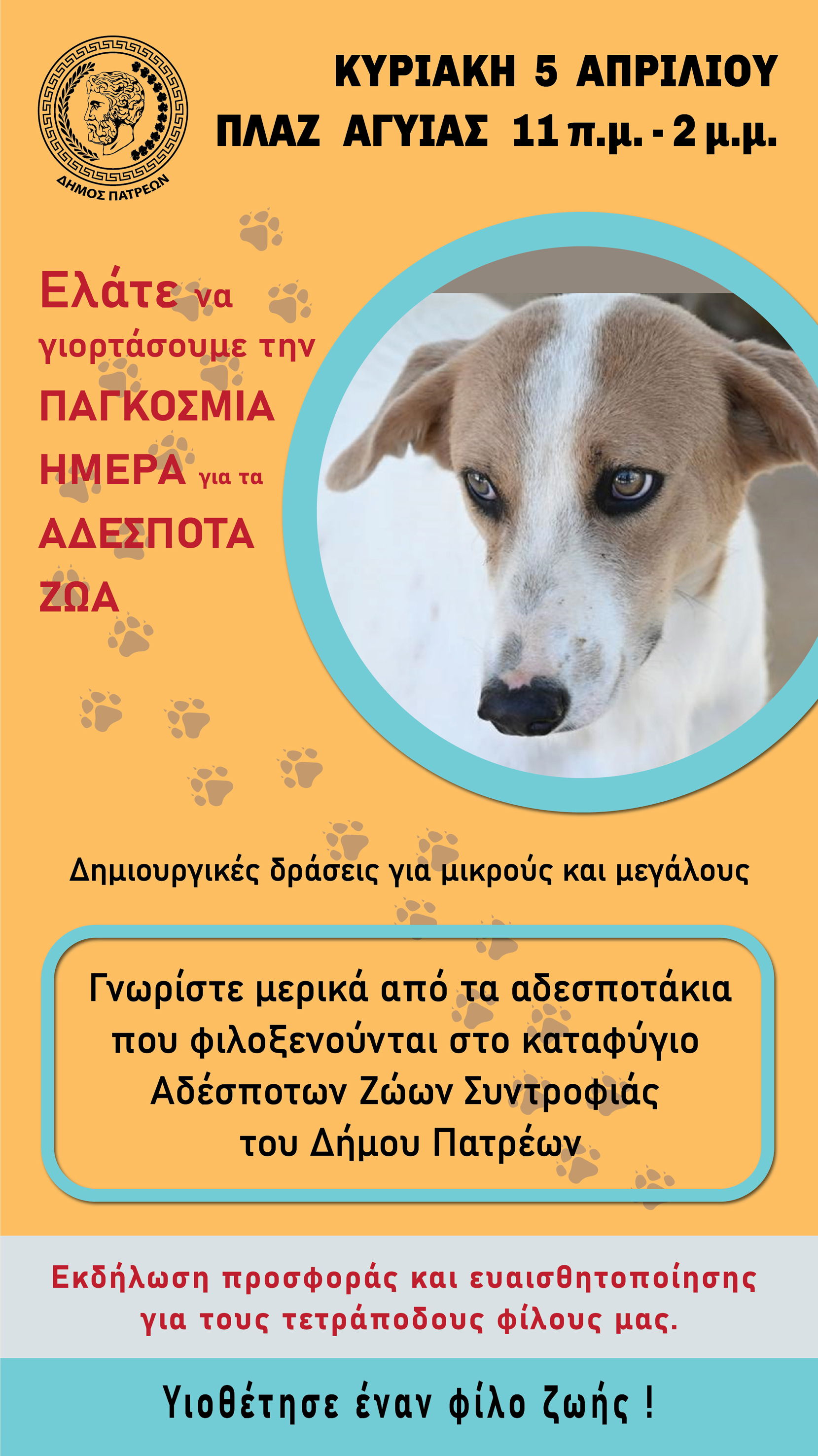 Υιοθέτησε ένα φίλο ζωής! - Εκδήλωση του Δήμου Πατρέων την Κυριακή 5 Απριλίου για τα αδέσποτα